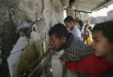 A Palestinian boy drinks from a water tap as others wait to fill up water containers in Khan Younis in the southern Gaza Strip.