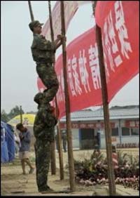Soldiers fix propaganda banners at a refugee camp in Sichuan