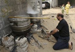 A Palestinian man cooks chicken using a wood-fuelled stove due to a shortage in cooking gas, in an outdoor kitchen in Gaza City, Thursday, Nov. 20, 2008.
