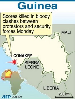 Map locating Conakry in Guinea where at least 87 people were killed Monday when security forces suppressed an opposition rally.