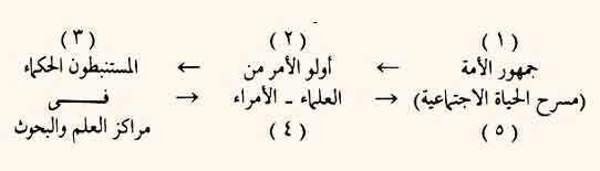 هكذا تتوزع الأدوار إذا واجهت الأمة قضية من قضايا الأمن أو الخوف، أو شأنا من شئون الحرب أو السلم؛ فالحس الجماهيري هـو الأداة القادرة على استشعار القضايا، أو المشكلات؛ لأن الجماهير هـي التي تتفاعل على مسرح الحياة الاجتماعية، ولها حق التعبير والإعلان عنها، ولكن ليس باللغو وإذاعة الإشاعات، وإنما بأداء دورها في دائرة فاعلة، دائمة الجريان، حيث تبدأ الجماهير برد القضايا والمشكلات إلى أولي الأمر من العلماء الأمراء (وهم هـنا خلفاء الرسول صلى الله عليه وسلم ) ، ليردوها بدورهم إلى المتخصصين القادرين على علمها واستنباط وسائل معالجتها. ويمكن أن نمثل لهذه الدائرة الفاعلة في معالجة المشكلات والقضايا بالشكل التالي: