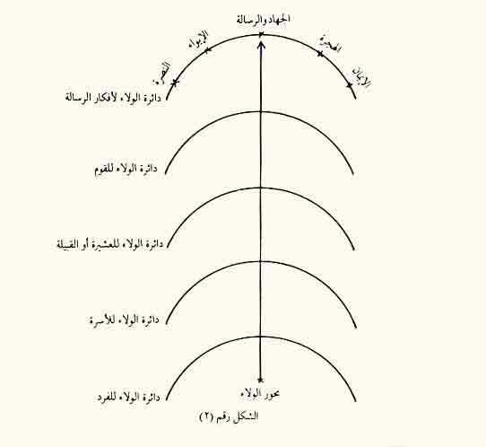 والتطبيق العملي للدوران المذكور، هـو أن يكون الولاء للرسالة هـو محور الأنشطة التي تكرس خلالها طاقات الأشخاص ومقدرات الأشياء في الأمة في سبيل تطبيق الأفكار الرسالة في الداخل، ونشرها في الخارج. وبذلك تصبح أفكار الرسالة هـي غايات الحياة، بينما يشكل جهاد الأشخاص وبذل الأشياء في هـذا الجهاد، دور الوسائل العامة لتحقيق هـذه الغاية. وبتعبير آخر " يخلف أشخاص الأمة " الرسول في نصرة أفكار الرسالة، فتظهر - الخلافة- وتحدد مواقع الأفراد ووظائفهم طبقا لدرجة قدرتهم على خلافة الرسول في