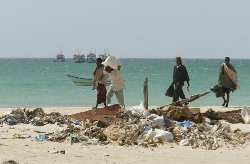 Somali men walk past unidentified garbage washed on to the beach in Hafun in north eastern Somalia, Monday, Jan. 31, 2005 after the devastating tsunami hit the area in late Dec. 2004.